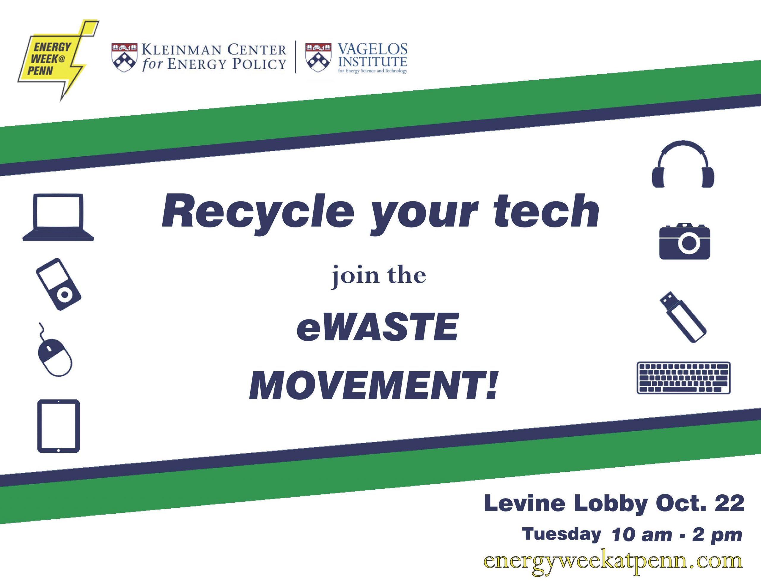 We will be collecting EWASTE items in Levine Lobby on Tuesday in support of Energy Week @ Penn campaign. This is a great opportunity to properly recycle non-traditional items such as: computers & printers computer accessories (keyboards, mice) Monitors, TVs, Displays Mobile phones household electronics (anything with a plug!) light bulbs non-recyclable glass